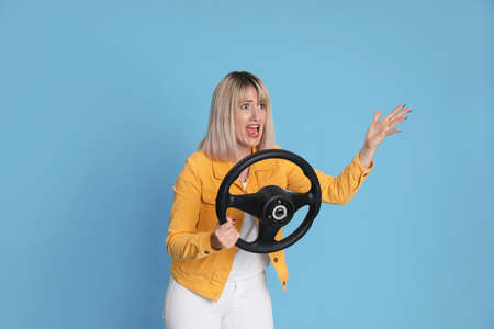 Emotional woman with steering wheel on light blue background