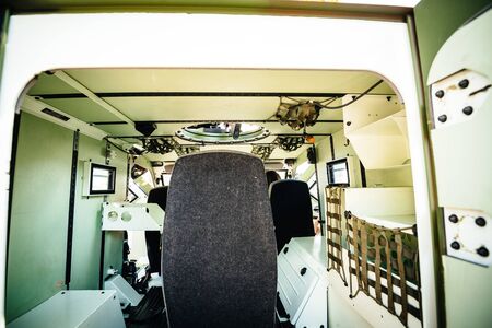 Empty train cabin of train driver. Interior of control place of train. Cockpit of train.