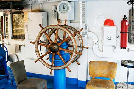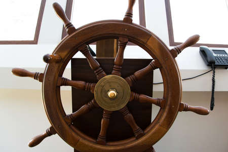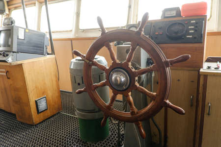 Old wooden steering wheel on modern tugboat