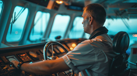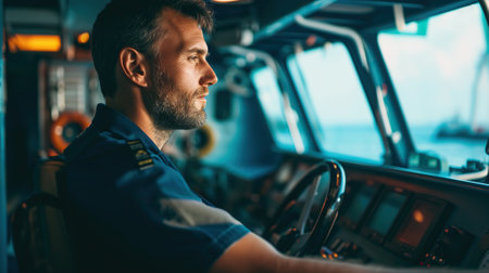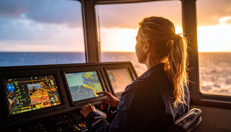 Ship bridge captain monitors multiple navigation screens at dusk with ocean horizon visible through windows, focused and calm
