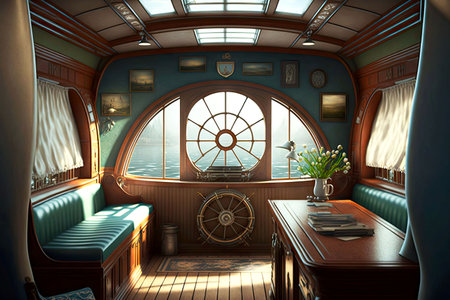vintage-style yacht Interior with wooden walls, leather diva and large porthole
