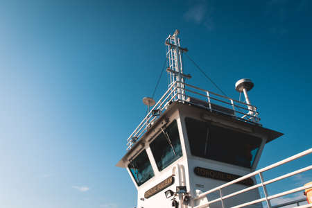 Ferry boat white cabin with big windows. Wing of running bridge of cruise liner. white cruise ship on a blue sky with navigation system. Captain's cabin.