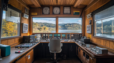 Interior of a control room featuring wooden paneling, various gauges, screens, and control panels. The room has a large window.