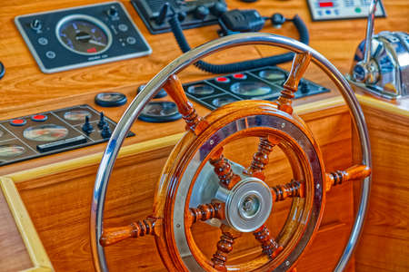 Steering wheel and dashboard of a yacht, close-up.