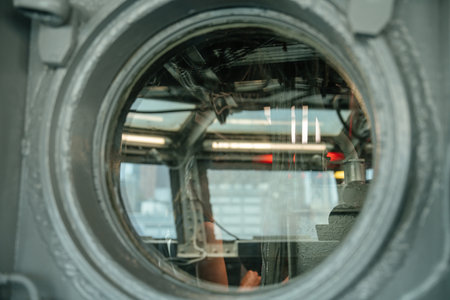 A circular porthole window reveals the interior of a ships cockpit with visible wiring and equipment. The image captures reflections and light from both inside and outside, creating a layered visual effect.
