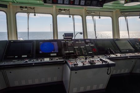 View of the control console on the navigational bridge of the cargo container ship.