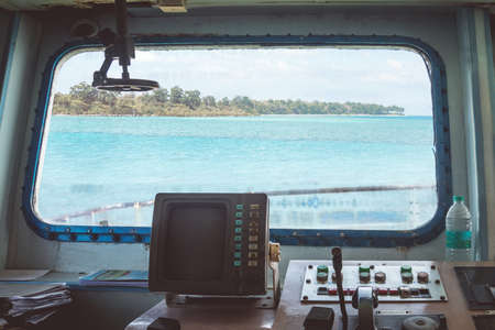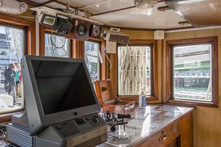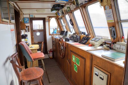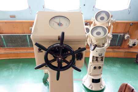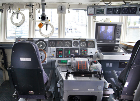 Interesting Ferry boat pilot command cabin. inside the captain's cabin. panel of ship devices