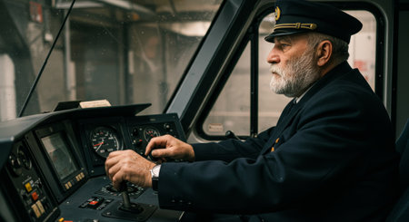 Train driver in uniform focused on steering the train in an industrial environment