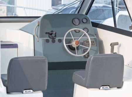 Interior of boat with steering wheel and control panel