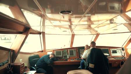 SOUTH ISLAND, NEW ZEALAND- MAY 25, 2017: Ferry boat pilot command cabin with the captain operating the machines with a two assistants, in new zealand