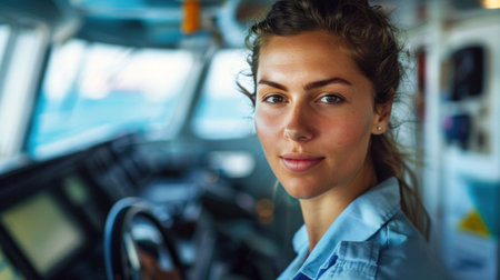 Confident woman in a blue shirt, smiling while sitting at the helm of a ship, with a blurred nautical background