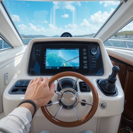 Nautical Control Panel, Private Yacht Steering Wheel and Modern Dashboard, Generative AI
