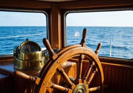 Wooden ship wheel on vintage boat interior against ocean background. That the image is generated using AI.