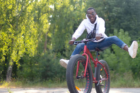 A happy African-American man rides a bicycle in the park.