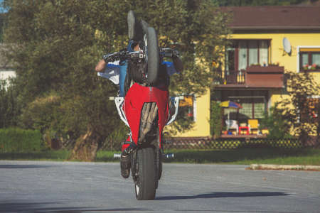 Motorcycle stunt man practicing on a home parking lot on a red and white motorcycle. Frontal view of a stuntman making a wheelie on a motorcycle.