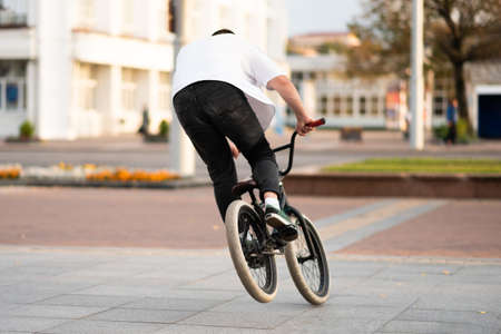 Guy riding a bmx bike on the street. Freestyle BMX in the city, extreme sports concept