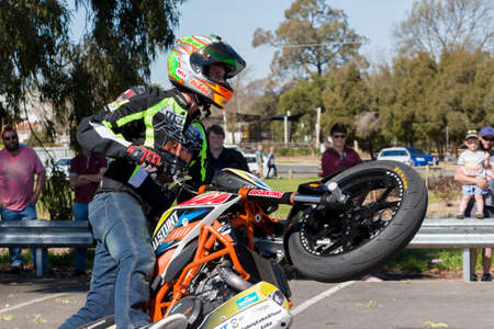 VICTORIAAUSTRALIA - SEPTEMBER 2015: Stunt motorcycle rider performing at a local car show on the 13 September 2015 in Corowa.