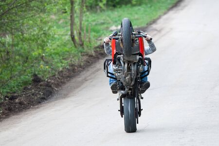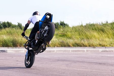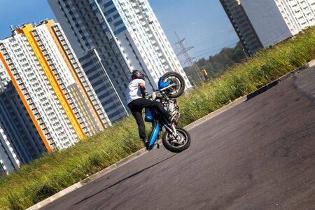 Moscow, Russia - Jul 12, 2020: Moto rider making a stunt on his motorbike. Motorcyclist making wheelie a difficult and dangerous stunt on his motorbike