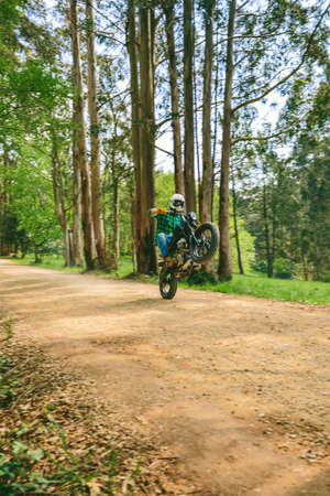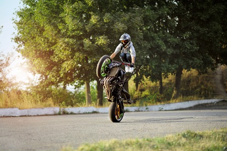 Stunt rider making stoppie on the summer forest background