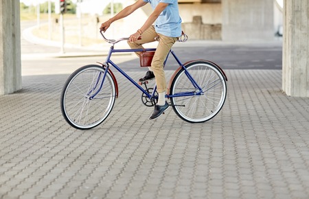 people, style and lifestyle - hipster man riding fixed gear bike on city street