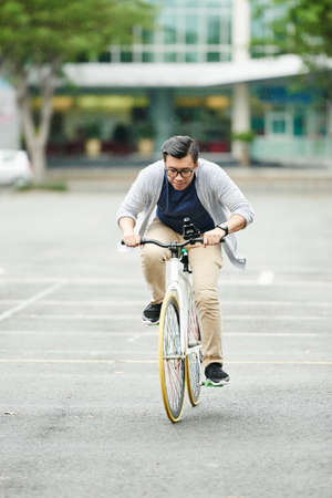 Asian man trying to ride bike as fast as possible