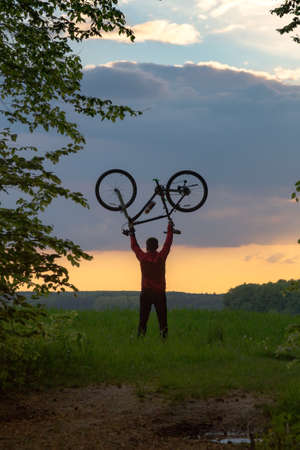 Biker holding his bike upside down at sunrise or sunset