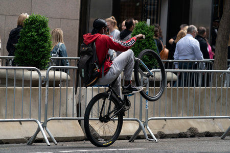 Central Park, New York, USA - 15 August 2018: A young man is popping a wheelie showing off to the camera in Central Park New York City with a blurred backgound.
