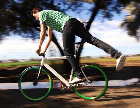 Young man doing tricks on his fixed gear bicycle