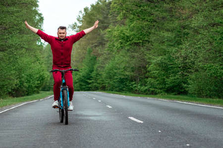 A man in a tracksuit rides a bicycle without hands on the road in the forest. The concept of a healthy lifestyle, cardio training. Copyspace