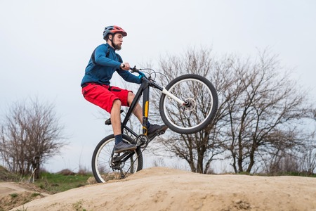 Man on a mountain bike performs a dirty jump. Active lifestyle, mtb.