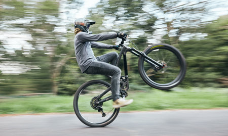 Bike, man and balance on wheel in nature for competition, challenge and adventure of motion in road. Cycling, sports race and fast action on bicycle for performance, energy with power, speed and risk