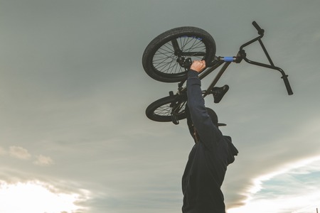Young man with a bmx bike. BMX rider doing tricks. Extreme urban sports concept