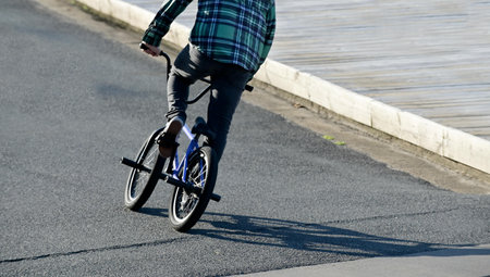 BRISBANE - OCT 10 2023:Person riding on BMX bike on the road.BMX biking requires physical fitness and coordination.
