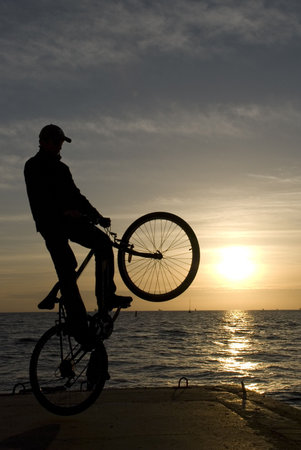 A silhouette of a woman doing a wheelie.