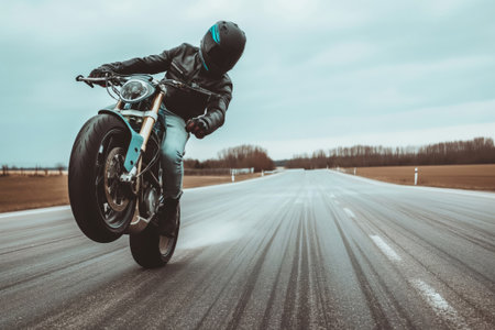 Skilled motorcyclist in protective gear pulls off an impressive wheelie on an empty, expansive highway under a cloudy sky