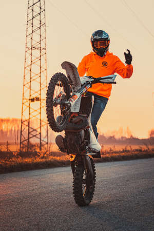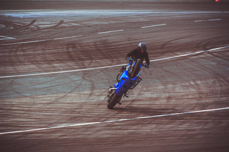 Moscow, Russia - Jul 12, 2020: Moto rider making a stunt on his motorbike. Stunt motorcycle rider performing motorcycle show. Motorcyclist making doing a difficult and dangerous stunt on his motorbike