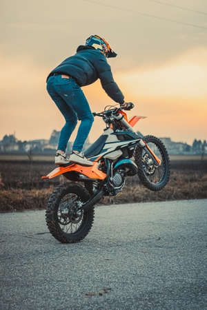 Young man with helmet doing wheelie with a custom motorbike outdoors