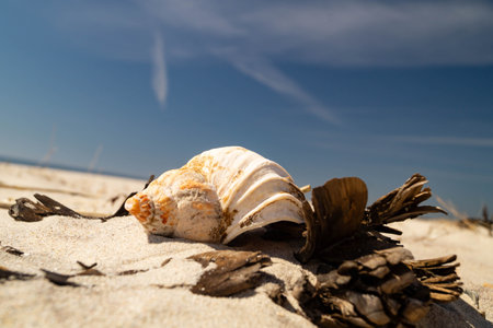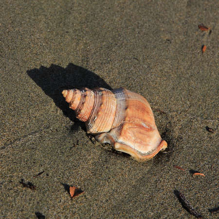 Beautiful seashell on the sandy beach. Summer vacation concept.