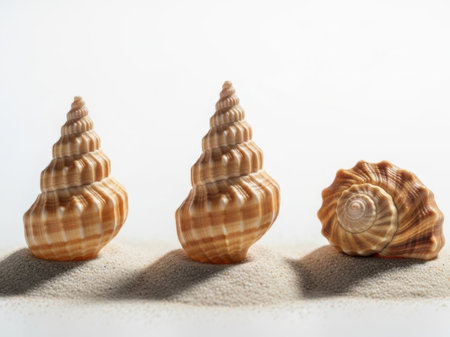This image features three seashells placed on a white background. The seashells vary in shape and size, with two standing upright and one lying flat. The white background provides a clean and clear focus on the seashells, making them the central elements of the image.