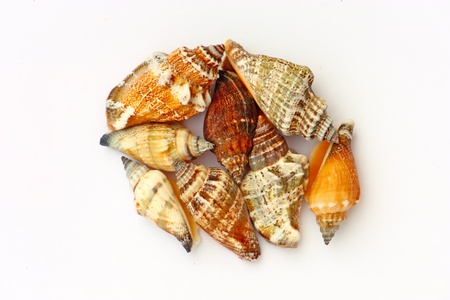 Close view detail of a group of different seashells isolated on a white background.