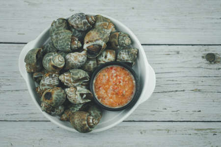 Spotted babylon Sea shell limpet with spicy seafood dipping, favorite appetizer seafood in Thailand