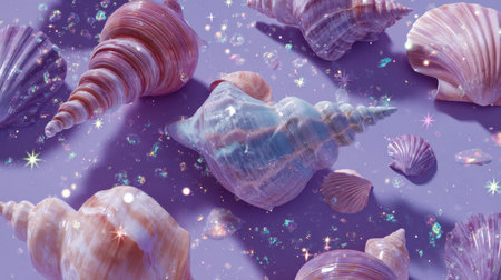 A captivating arrangement of seashells in pastel shades on a soft purple background, embellished with sparkling gems and glimmers, ideal for creative and artistic projects.