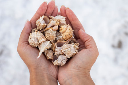 Natural shells collected on the beach. In hands, sea shells background image