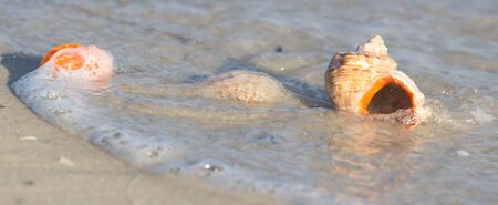 Beautiful sea shell in the water at sunset. Shallow depth of field