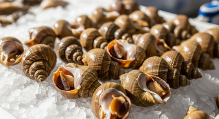 Raw snails in live shells on ice for sale at fish market