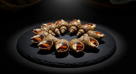 Artistic Display of Whelks on Black Plate