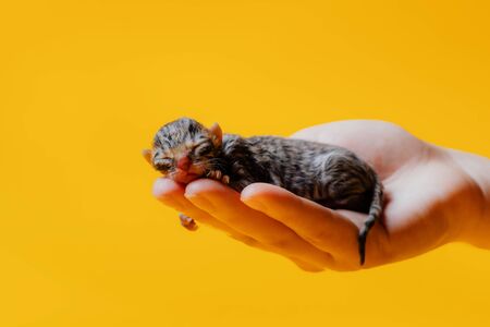 Newborn small kitten sleeping on hand of crop woman isolated on yellow