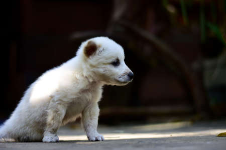 A very little white balinese puppy on the sand, outside, tropical island Nusa Lembongan, Indonesia.