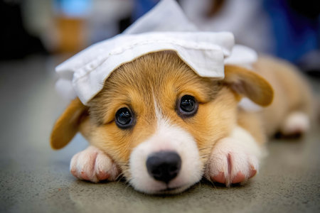 Close-up of a small, adorable puppy lying down, wearing a small white cloth hat. The puppy's face and paws are clearly visible, and the image showcases the softness of its fur and gentle expression. The focus is on the puppy's features and creates a heartwarming and tender mood.