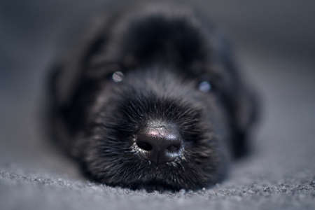Close-up of puppy of Black Giant Schnauzer. Nose of cute dog lying on sofa.